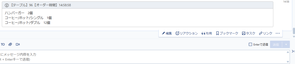 オーダーしたタイミングでChatworkの指定のグループにメッセージが投稿されるようになりました。