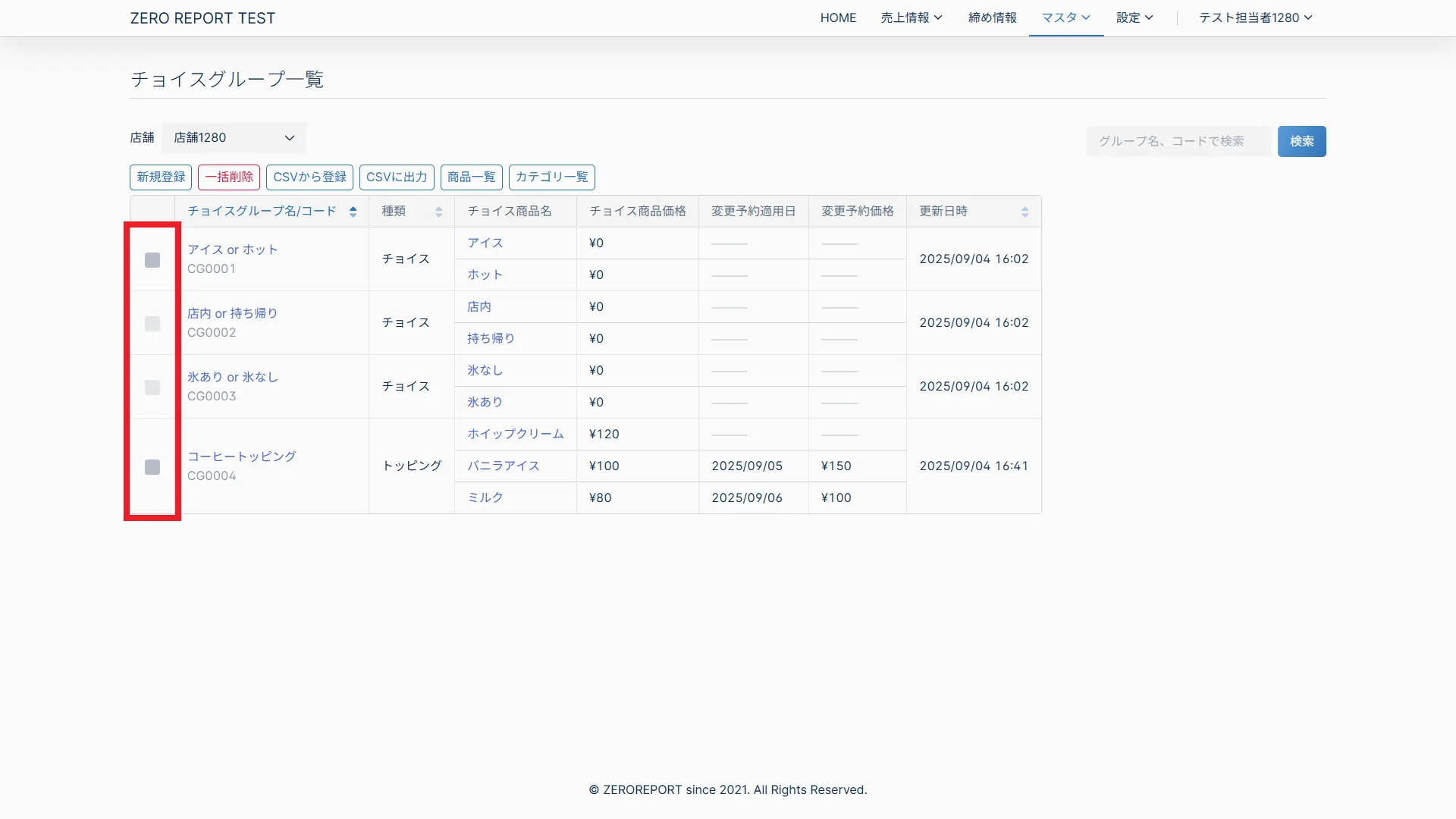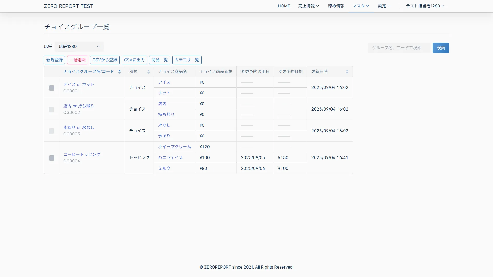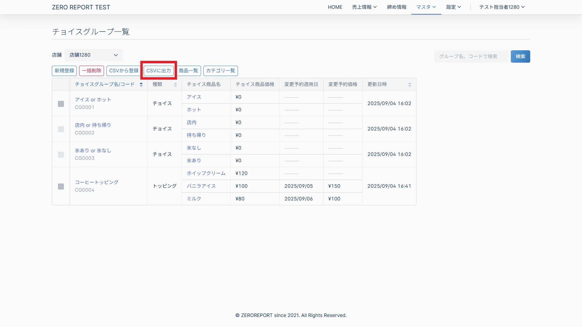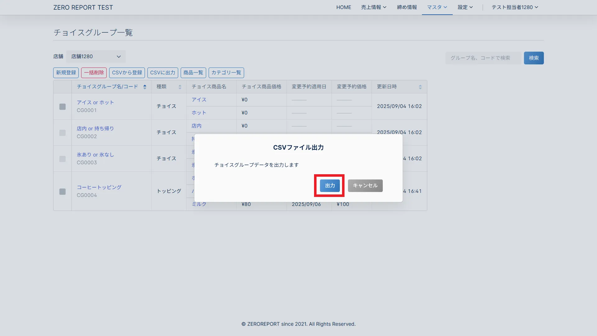- 出力されるデータは店舗に登録されている全てのチョイスグループ情報です。