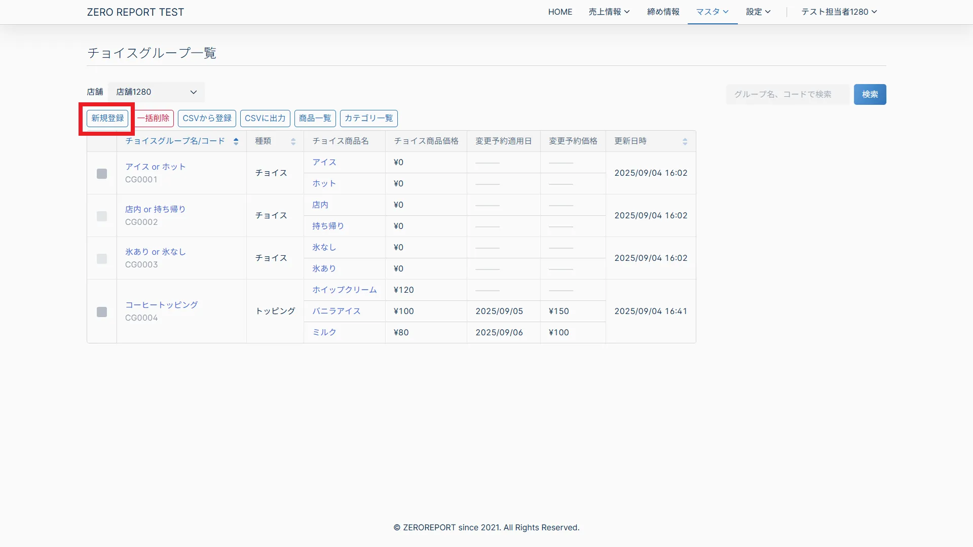 チョイスグループ一覧画面の左上にある「新規登録」ボタンをクリックします。