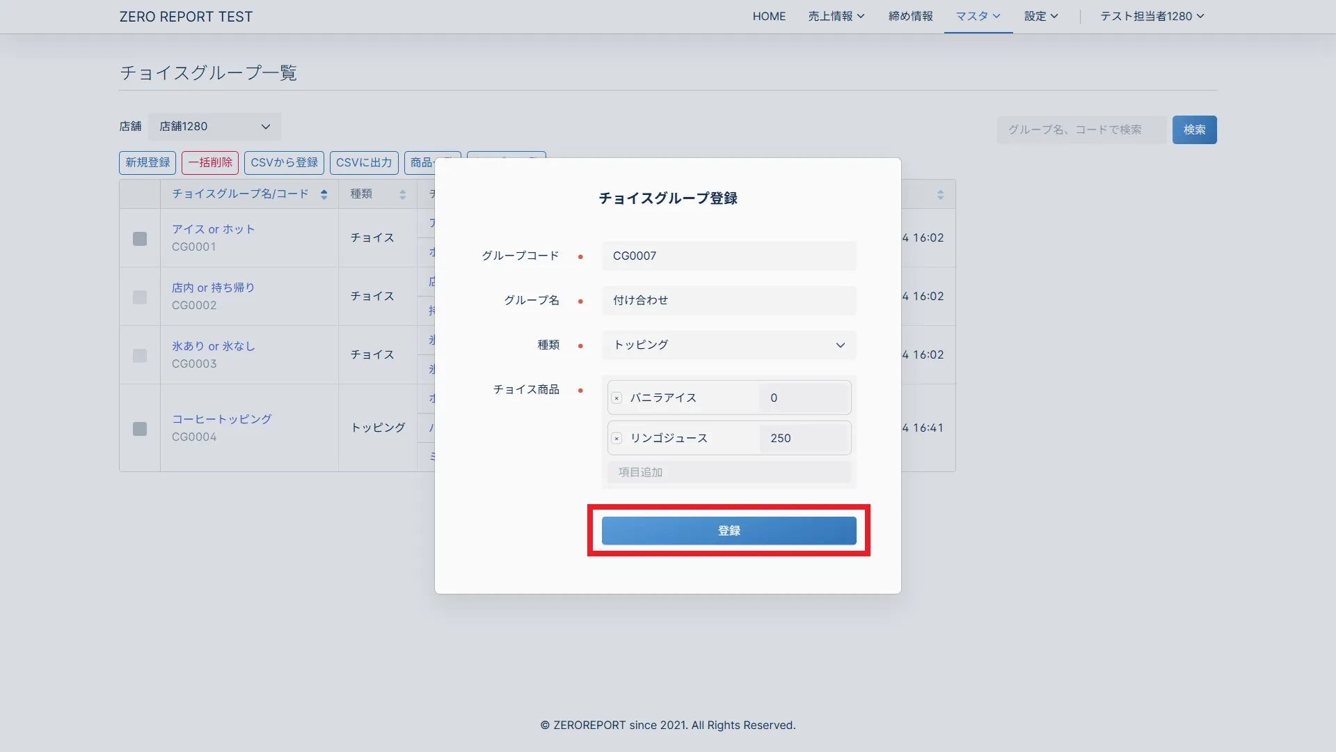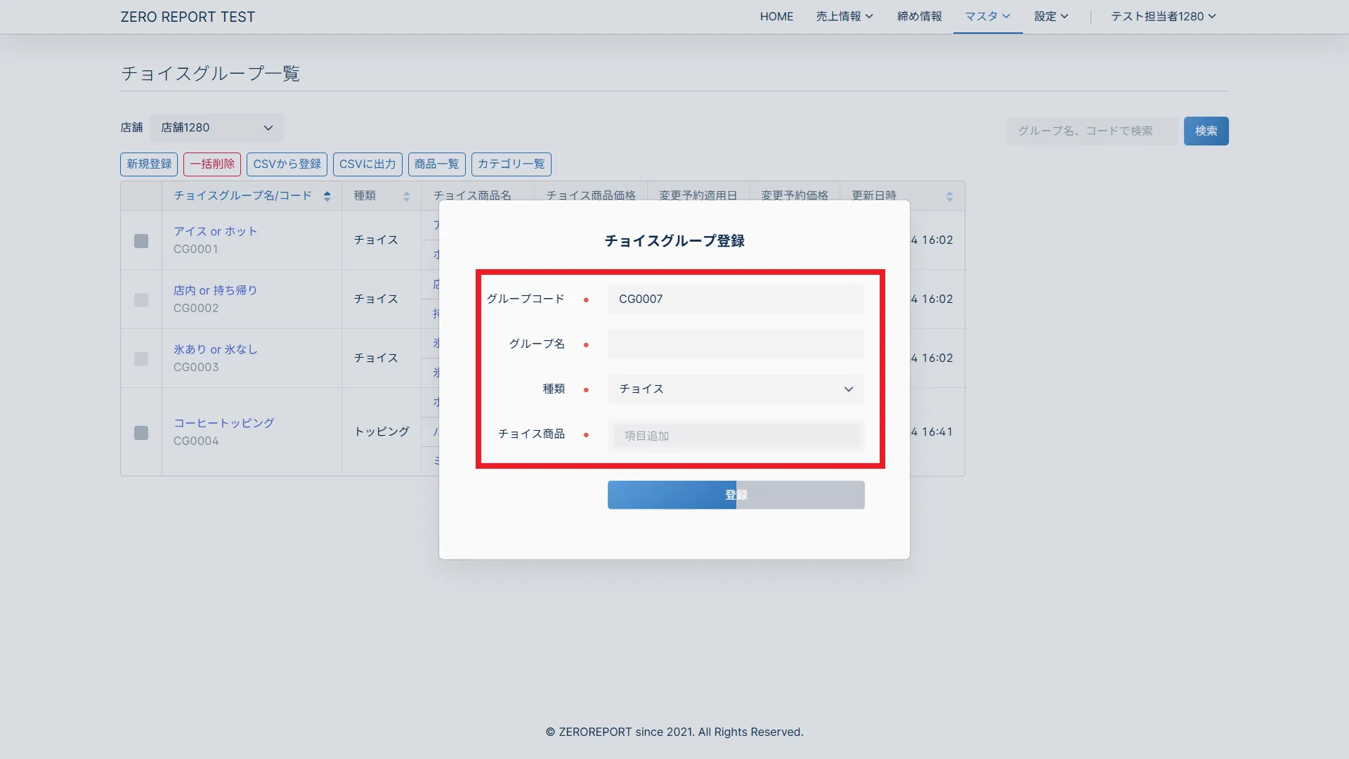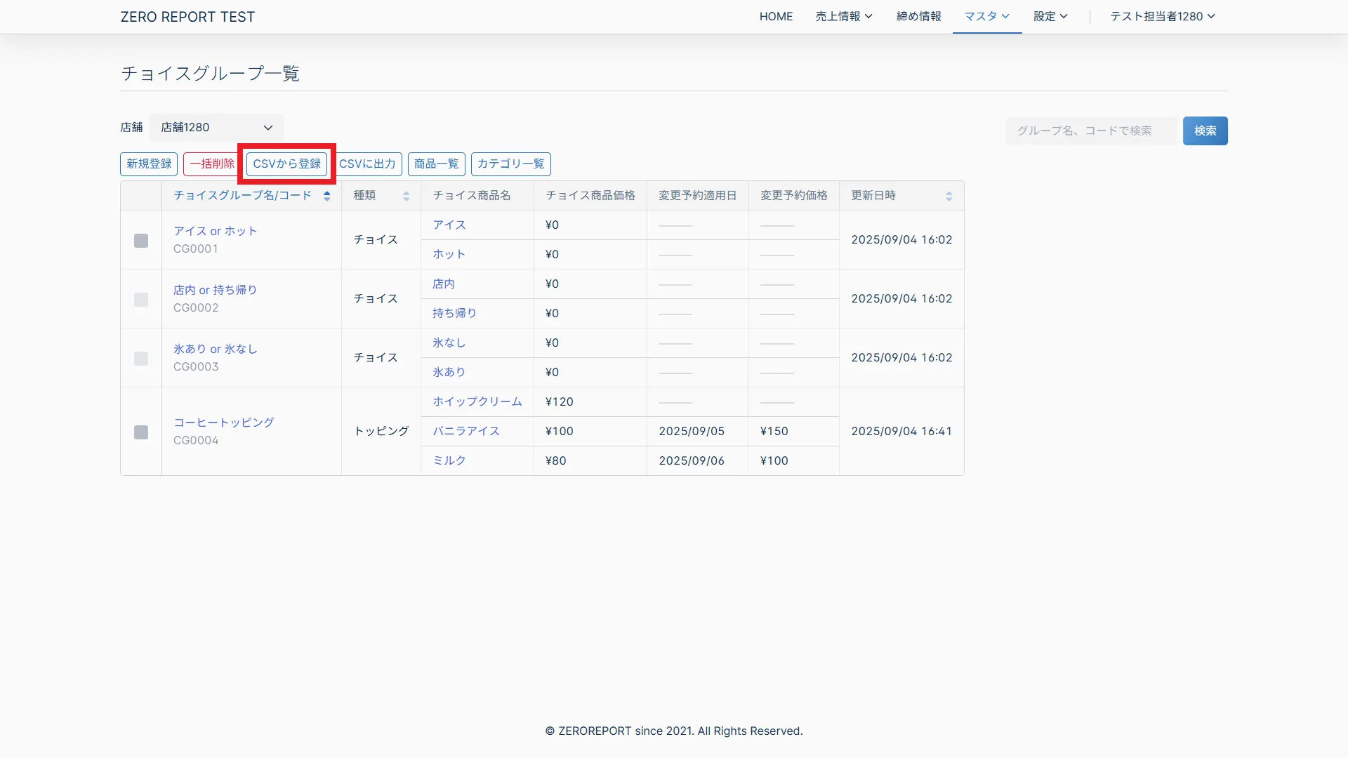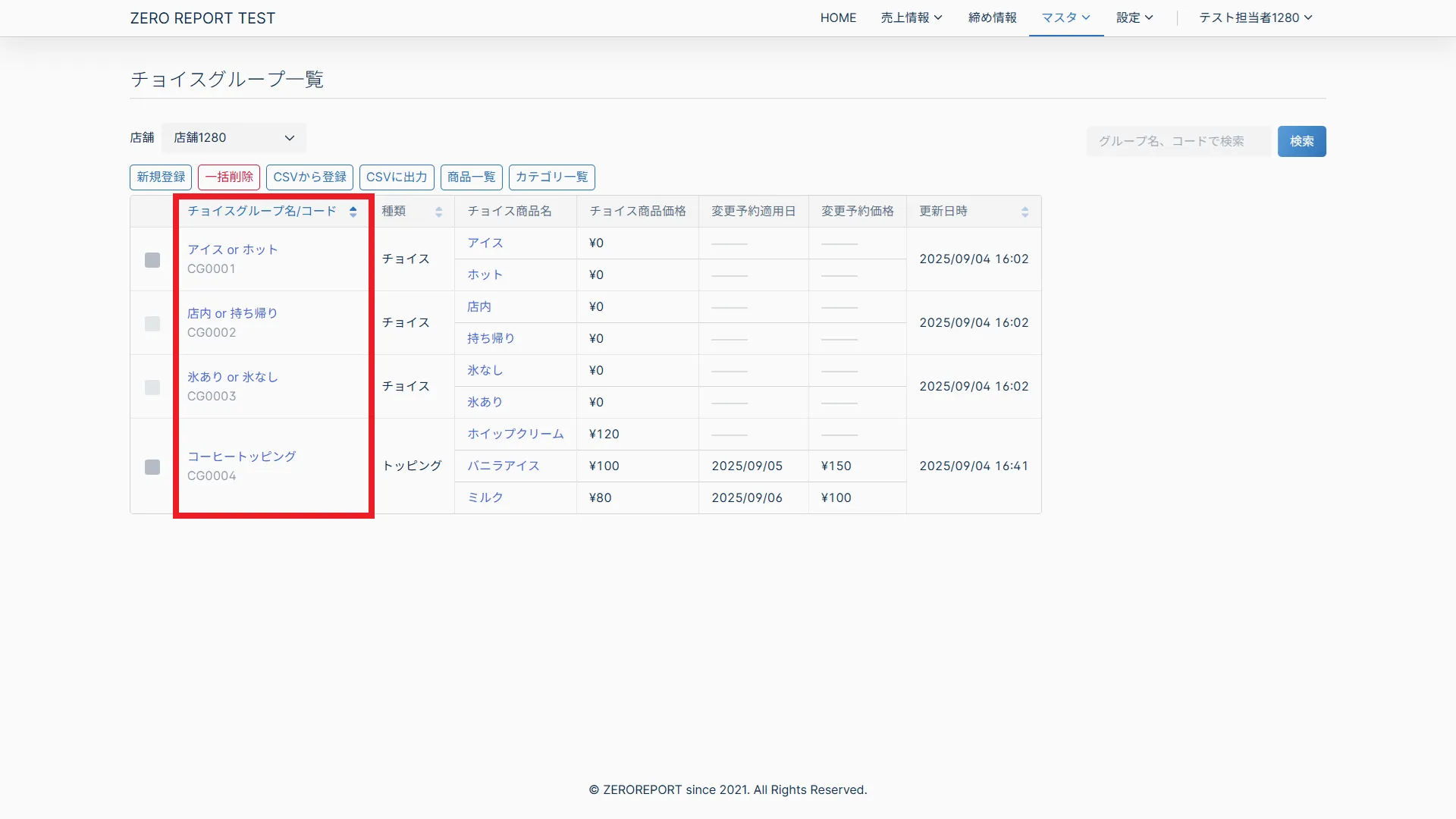 ヘッダメニューのマスタ-チョイスグループ一覧をクリックする。