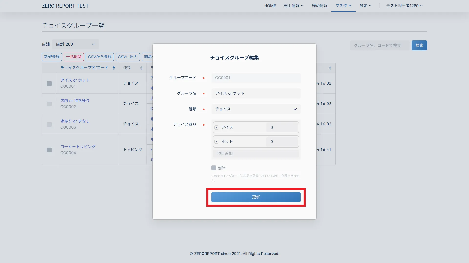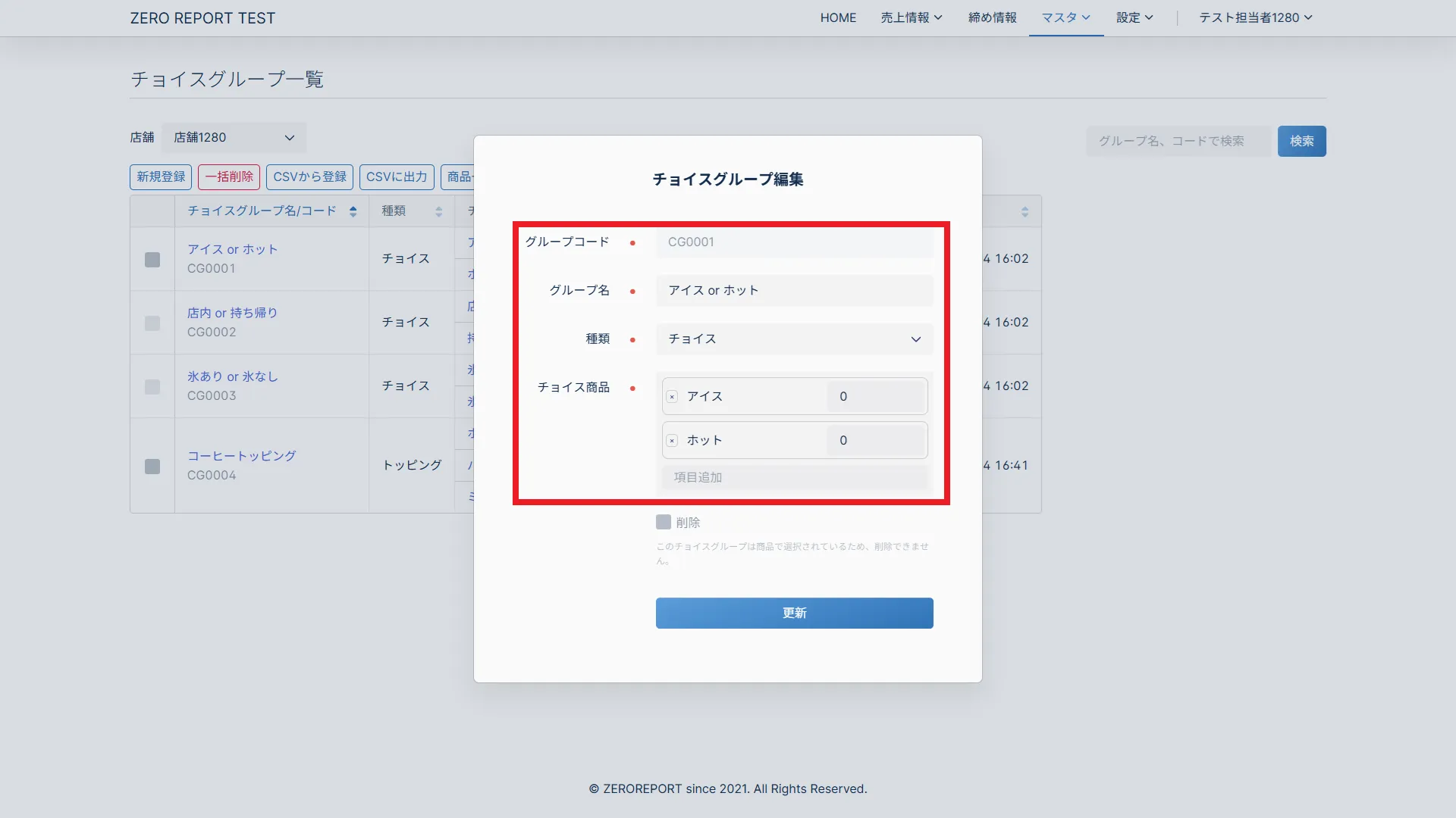 | チョイス商品 | アイス ホット | 氷あり 氷なし | 必須、重複選択不可、チョイスグループ設定のある商品は選択不可、最大20個まで選択可 |