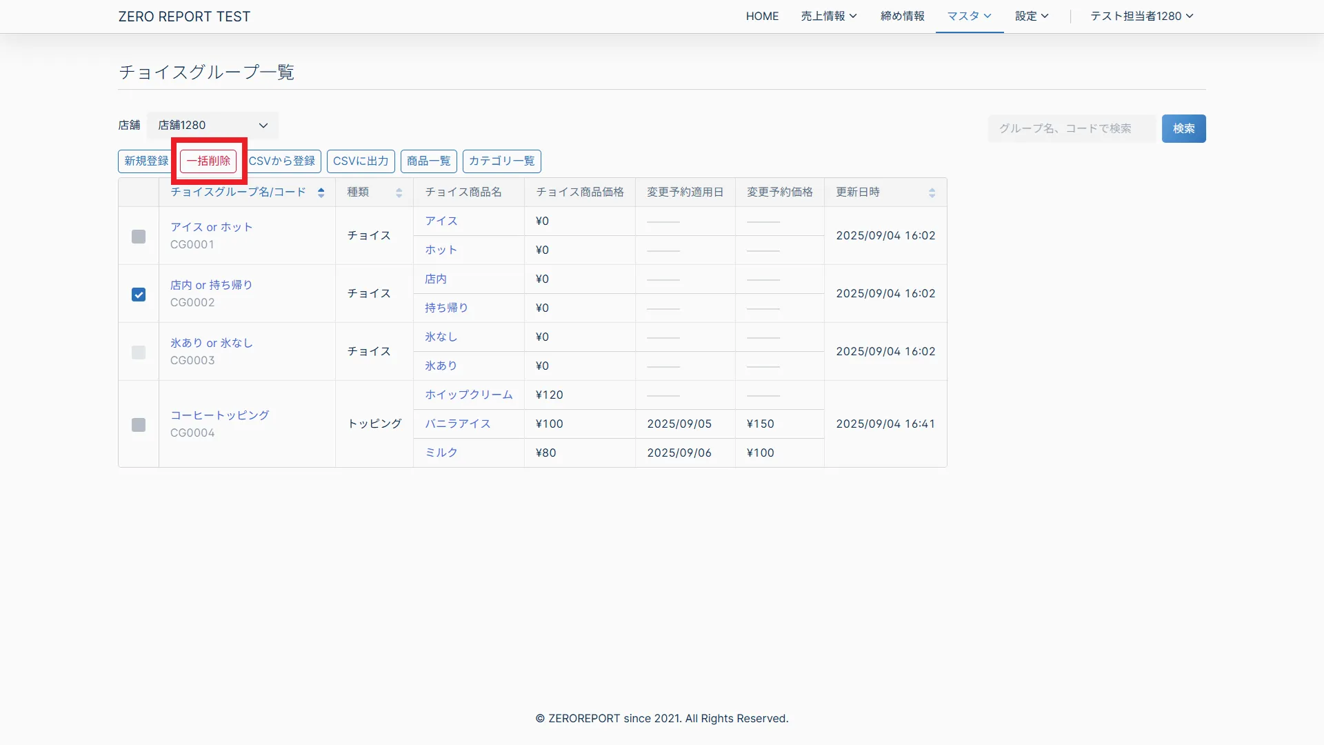 チョイスグループ一覧画面の左上にある「一括削除」ボタンをクリックします。