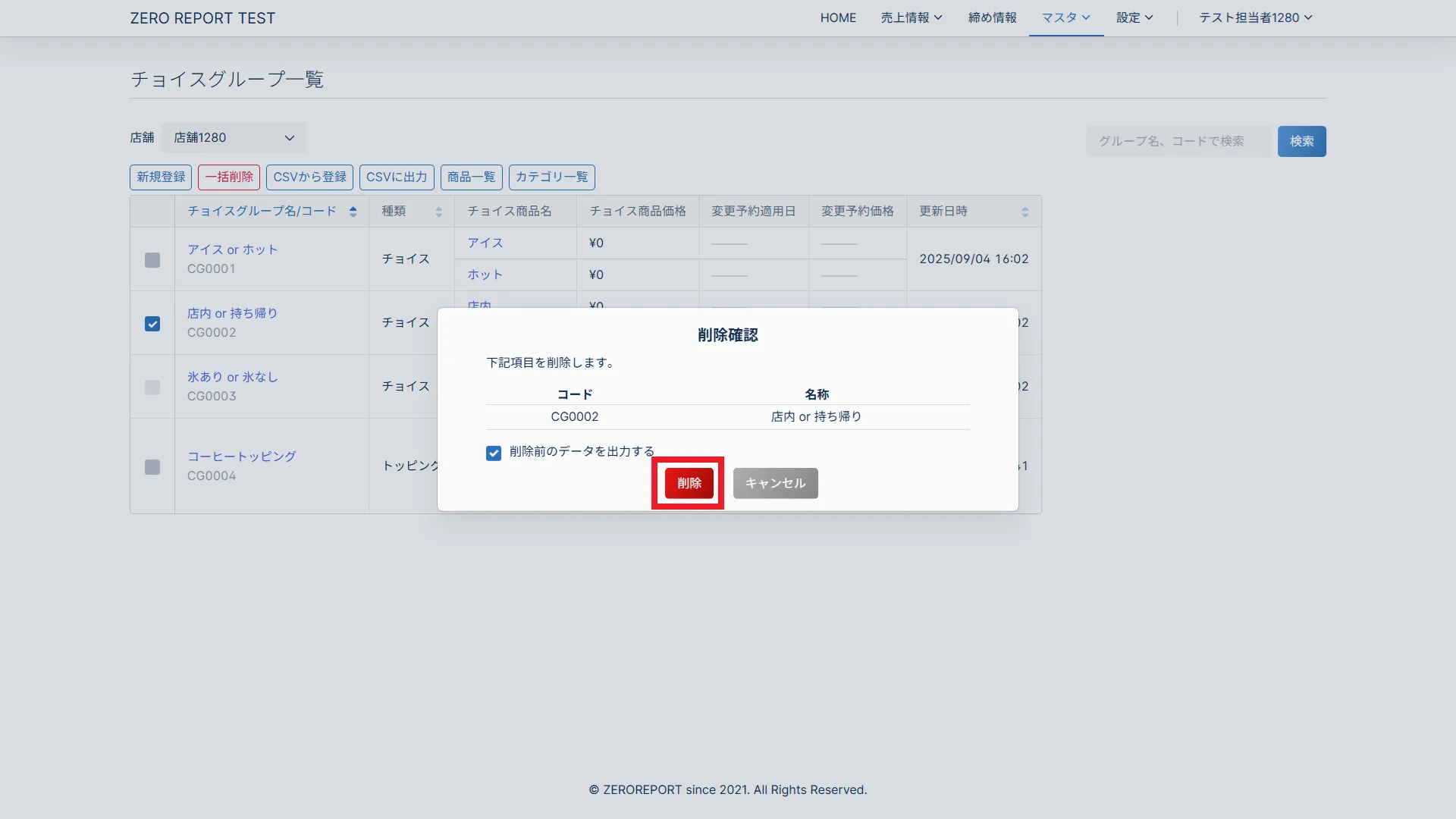 表示された確認ダイアログで「削除」を選択します。 「削除前のデータを出力する」にチェックがある場合、チョイスグループを削除する前のチョイスグループ一覧データがファイル出力されます。