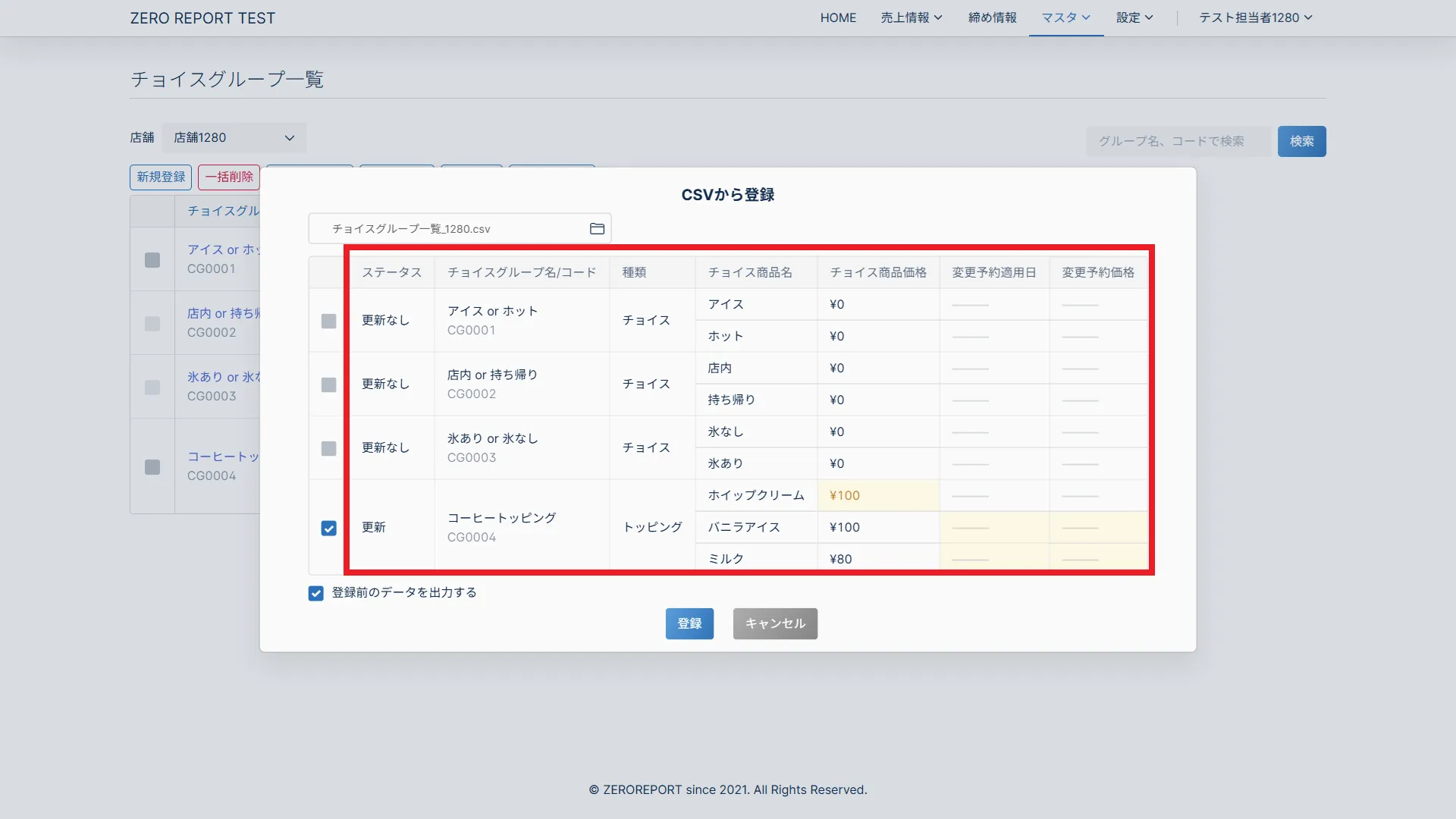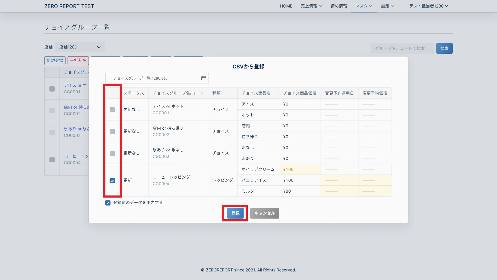 「登録前のデータを出力する」にチェックがある場合、一括登録前のチョイスグループ一覧データがファイル出力されます。