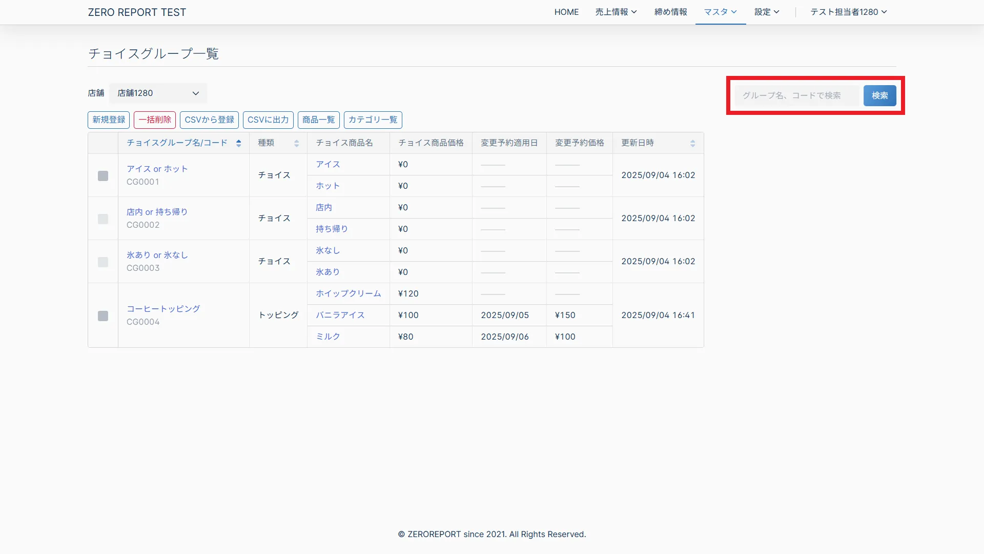 チョイスグループ名やチョイスグループコードで検索を行い、対象チョイスグループを素早く見つけることができます。