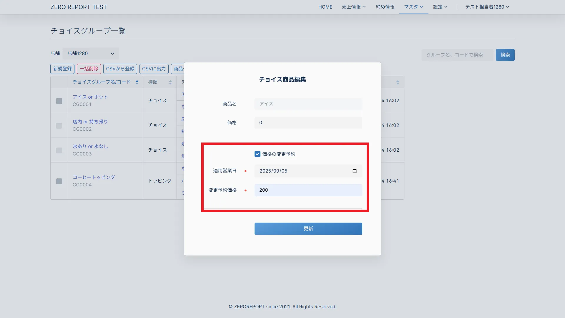 商品情報の編集画面で価格の変更予約を行うことができます。