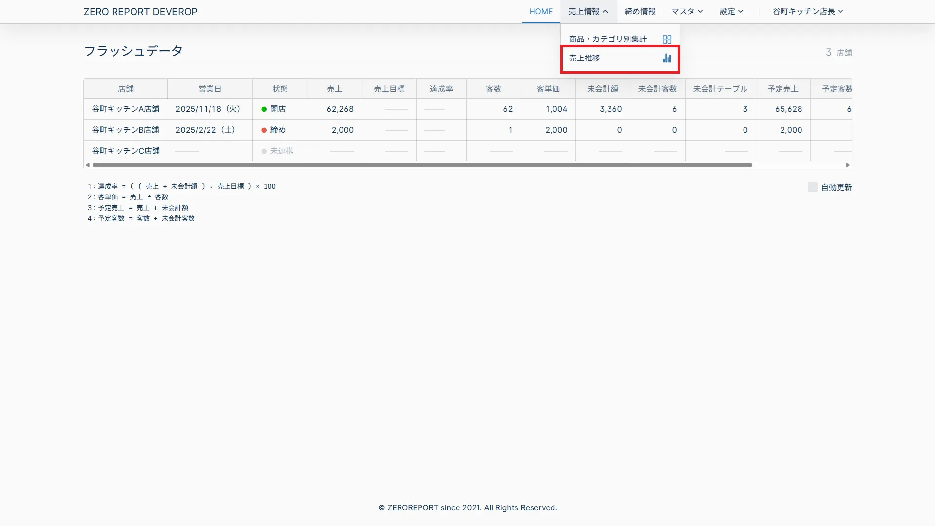 ヘッダーメニューの「売上情報」-「売上推移」をクリックする。