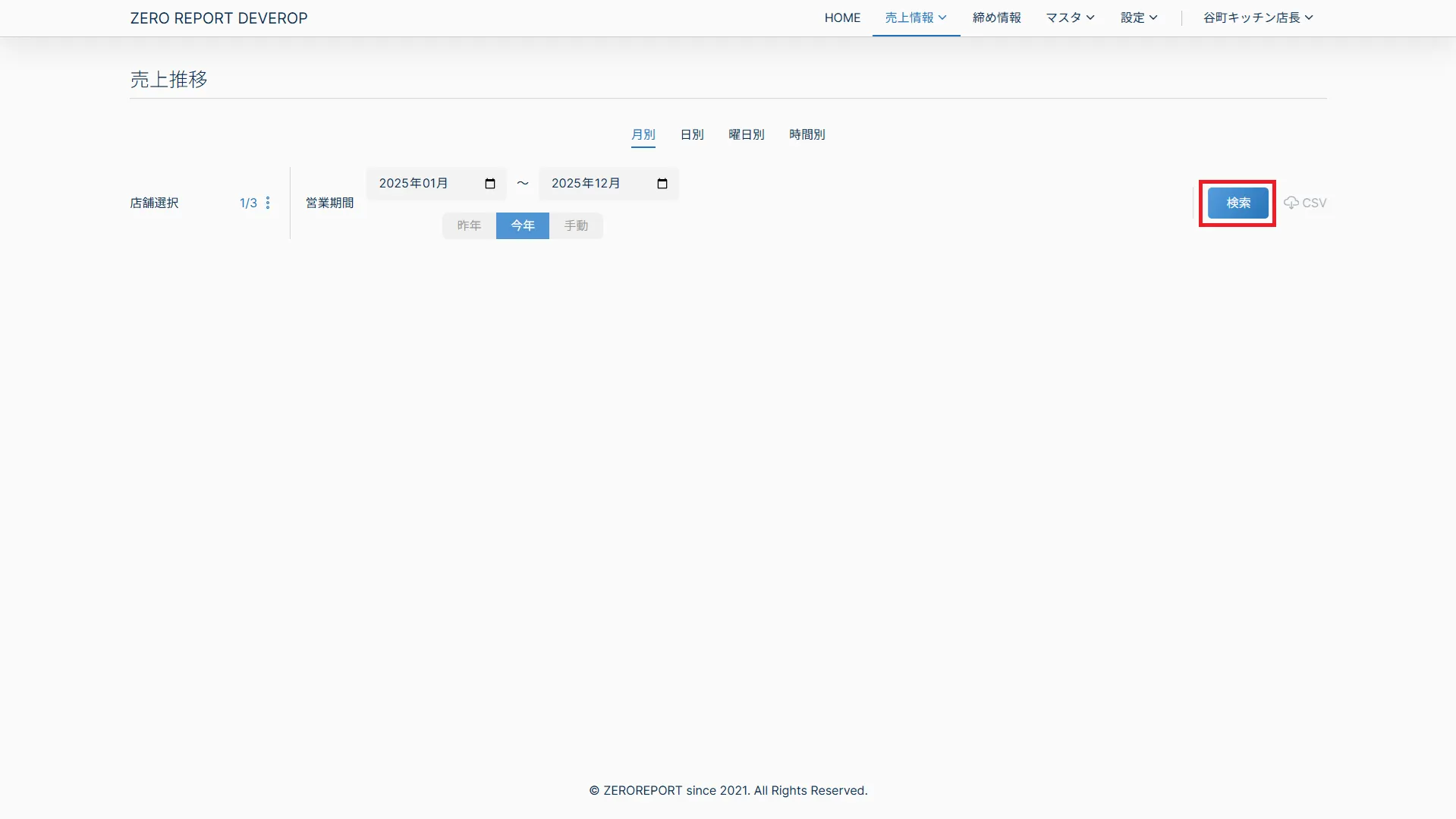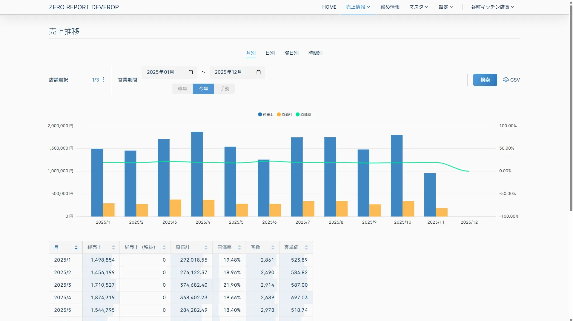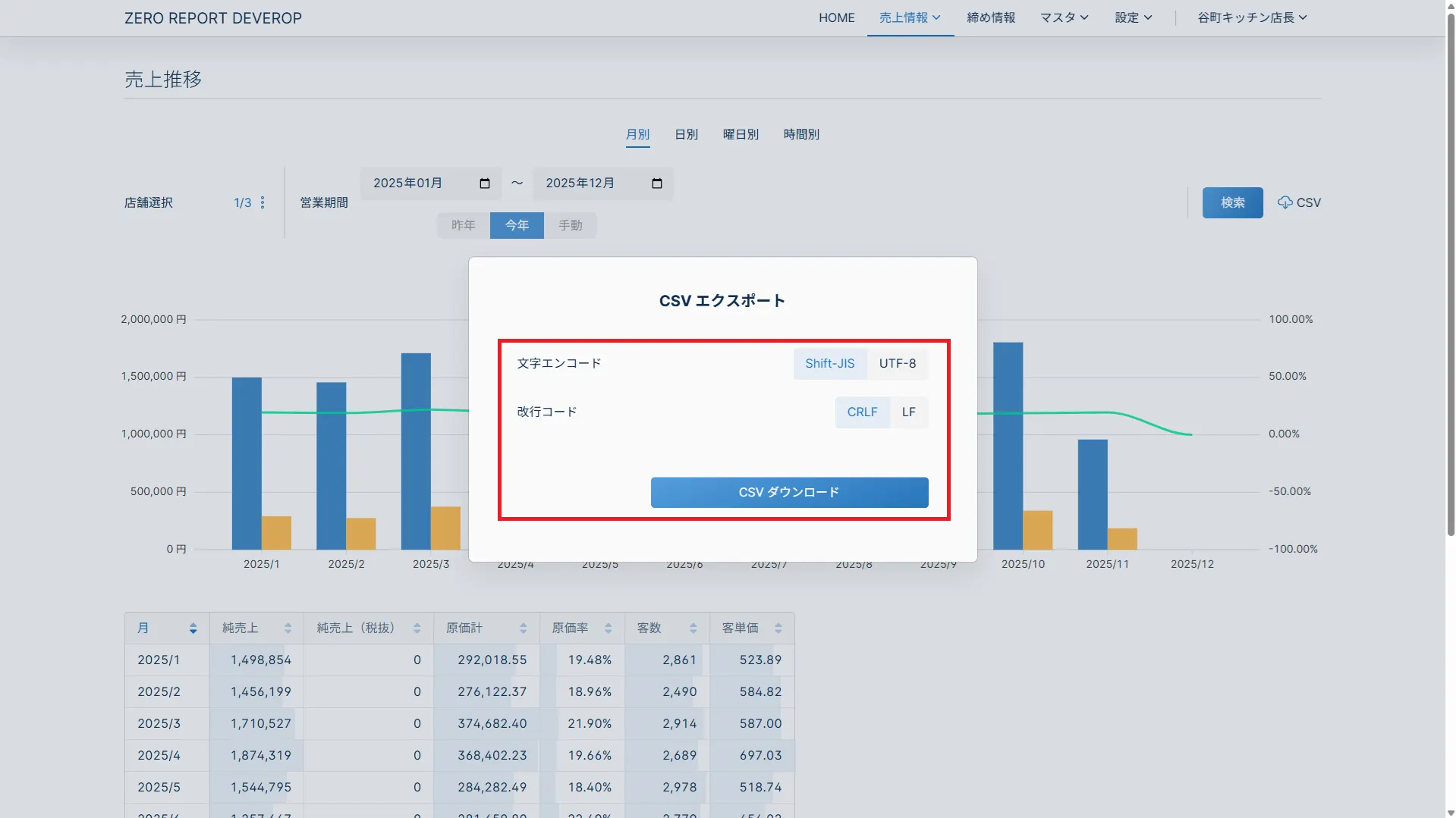 月別の売上推移データの表示し、データをCSVエクスポートします。