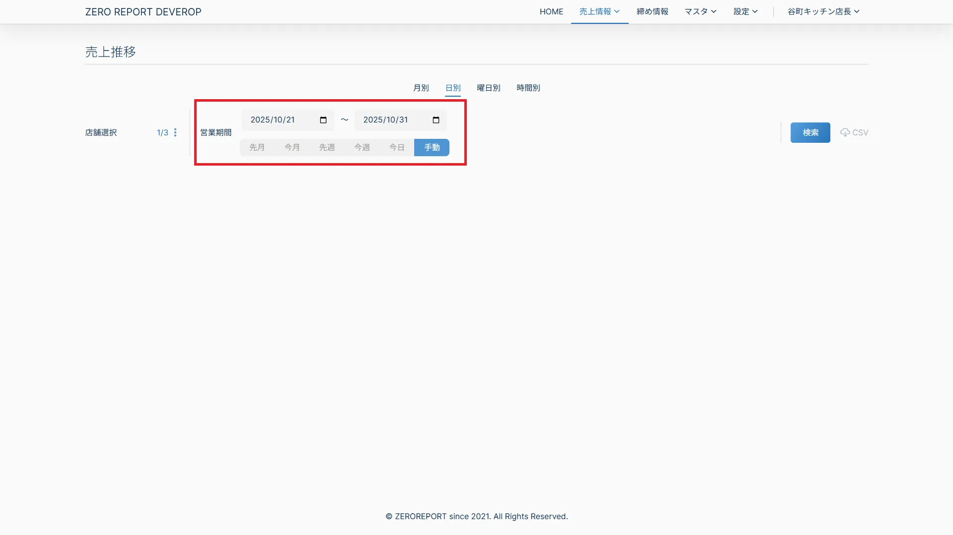 「日別」タブを選択し、日別売上推移画面を表示する。