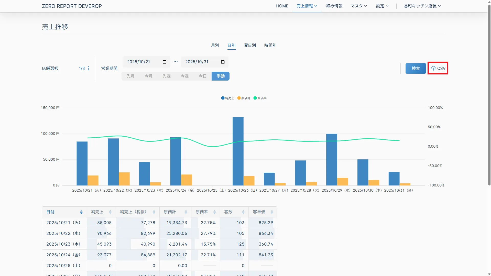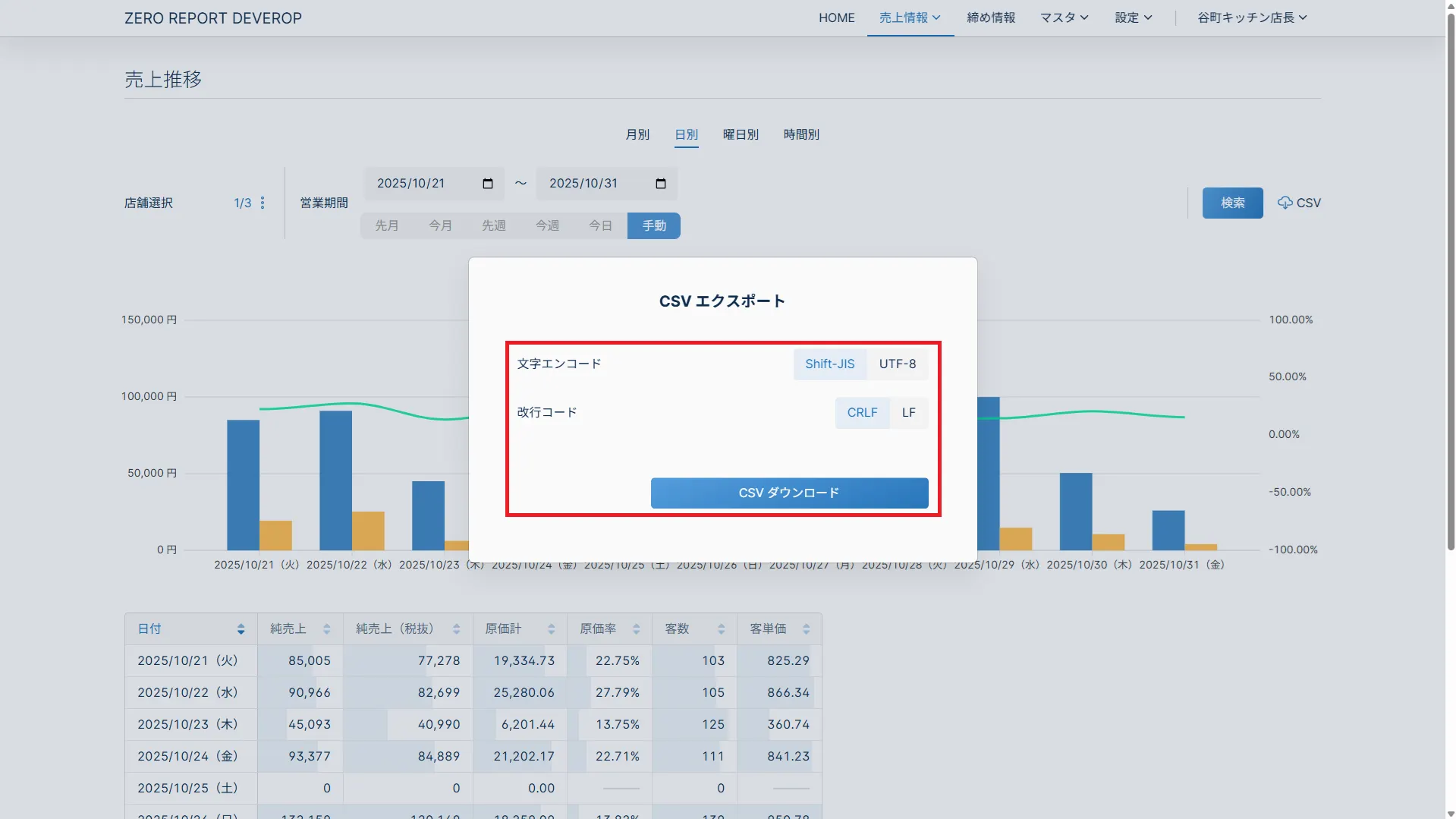 日別の売上推移データの表示し、データをCSVエクスポートします。