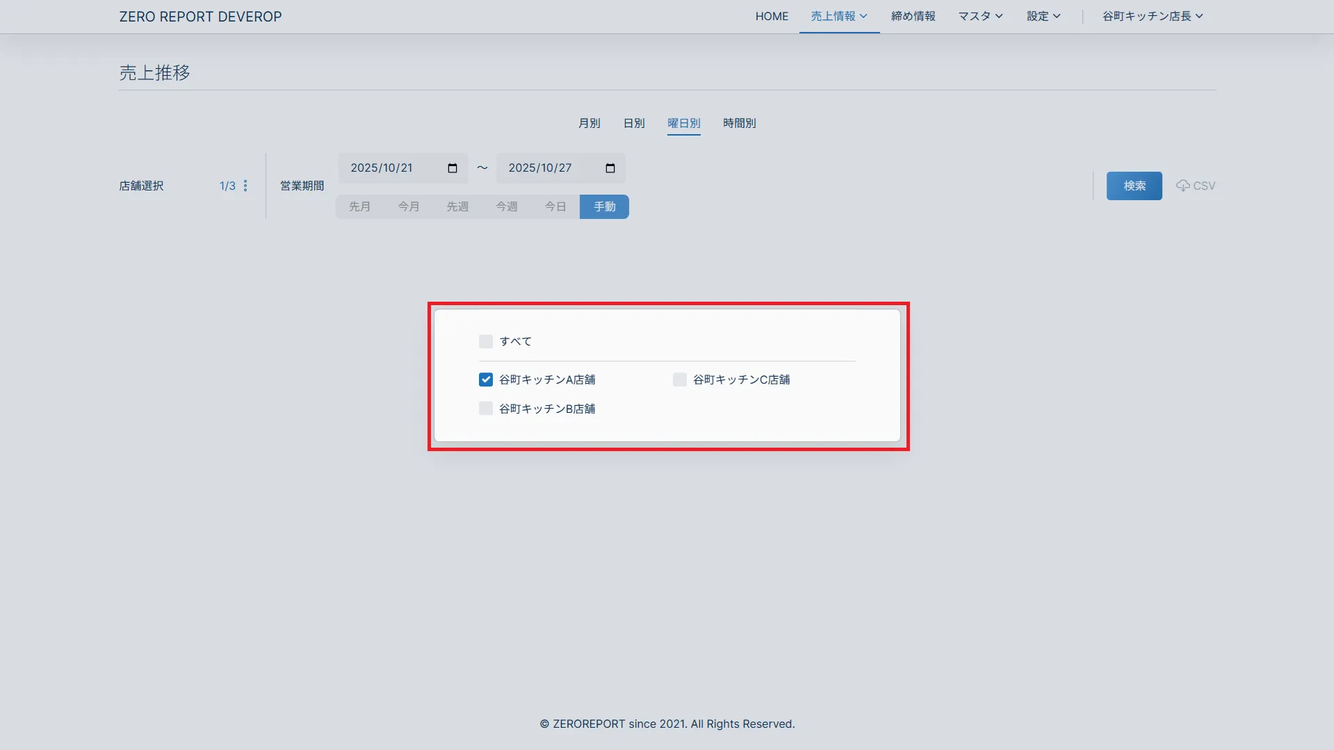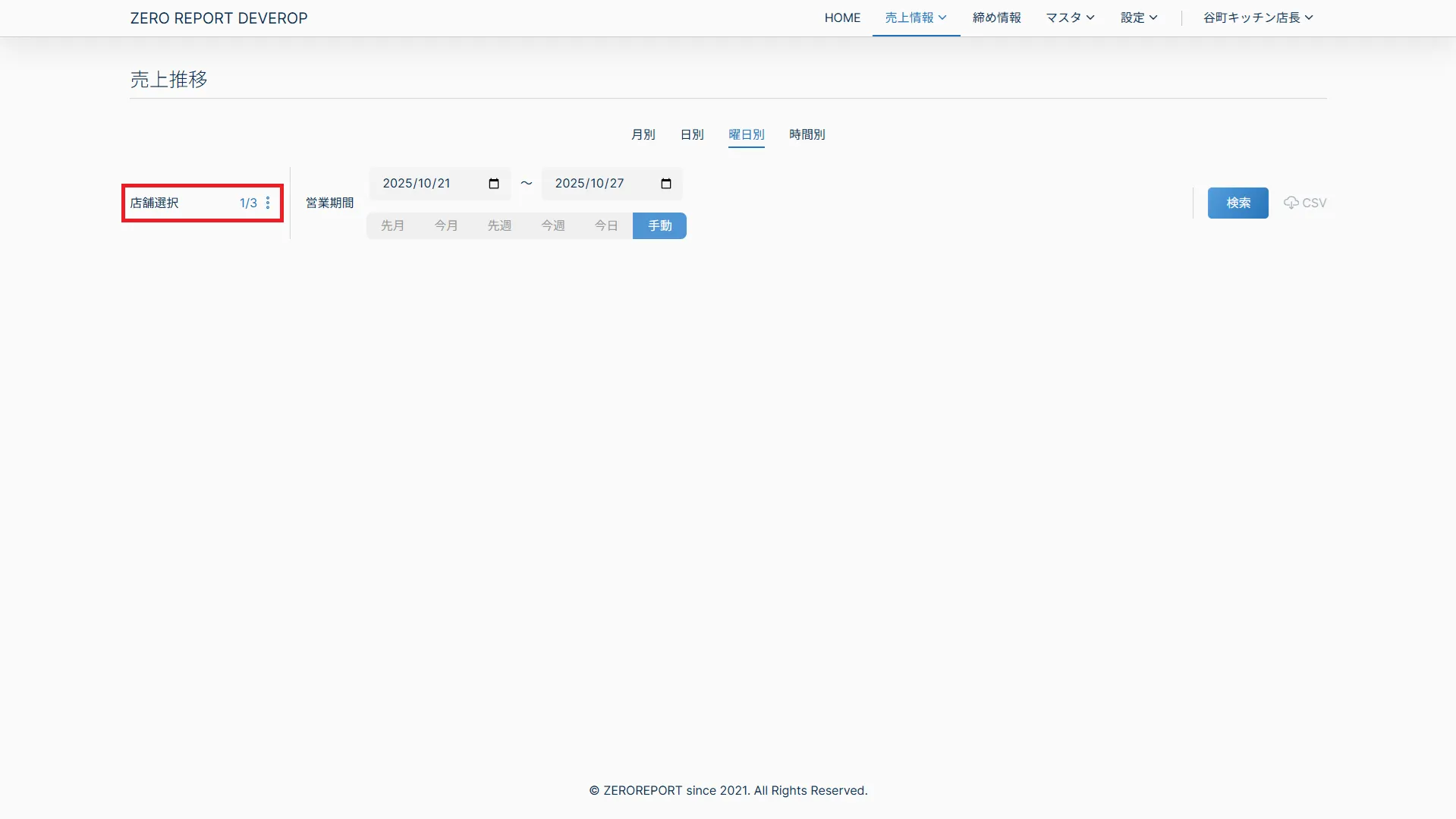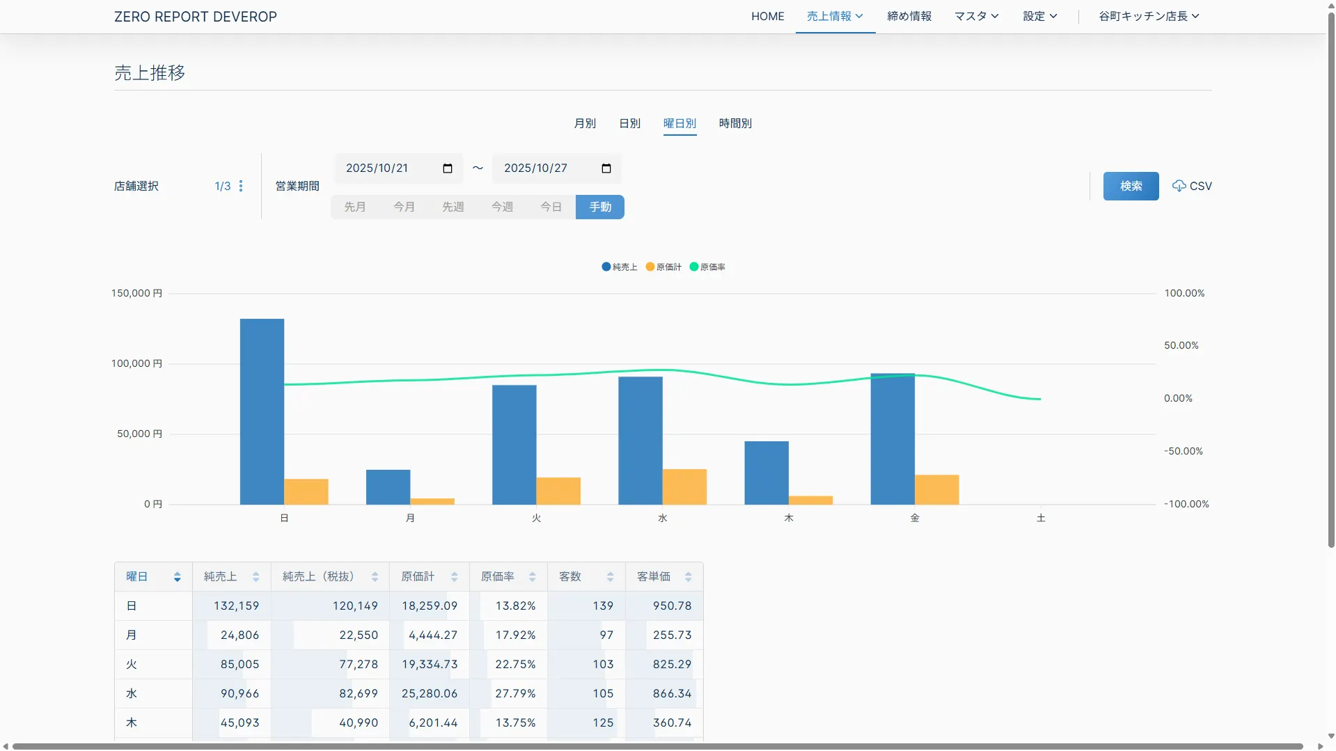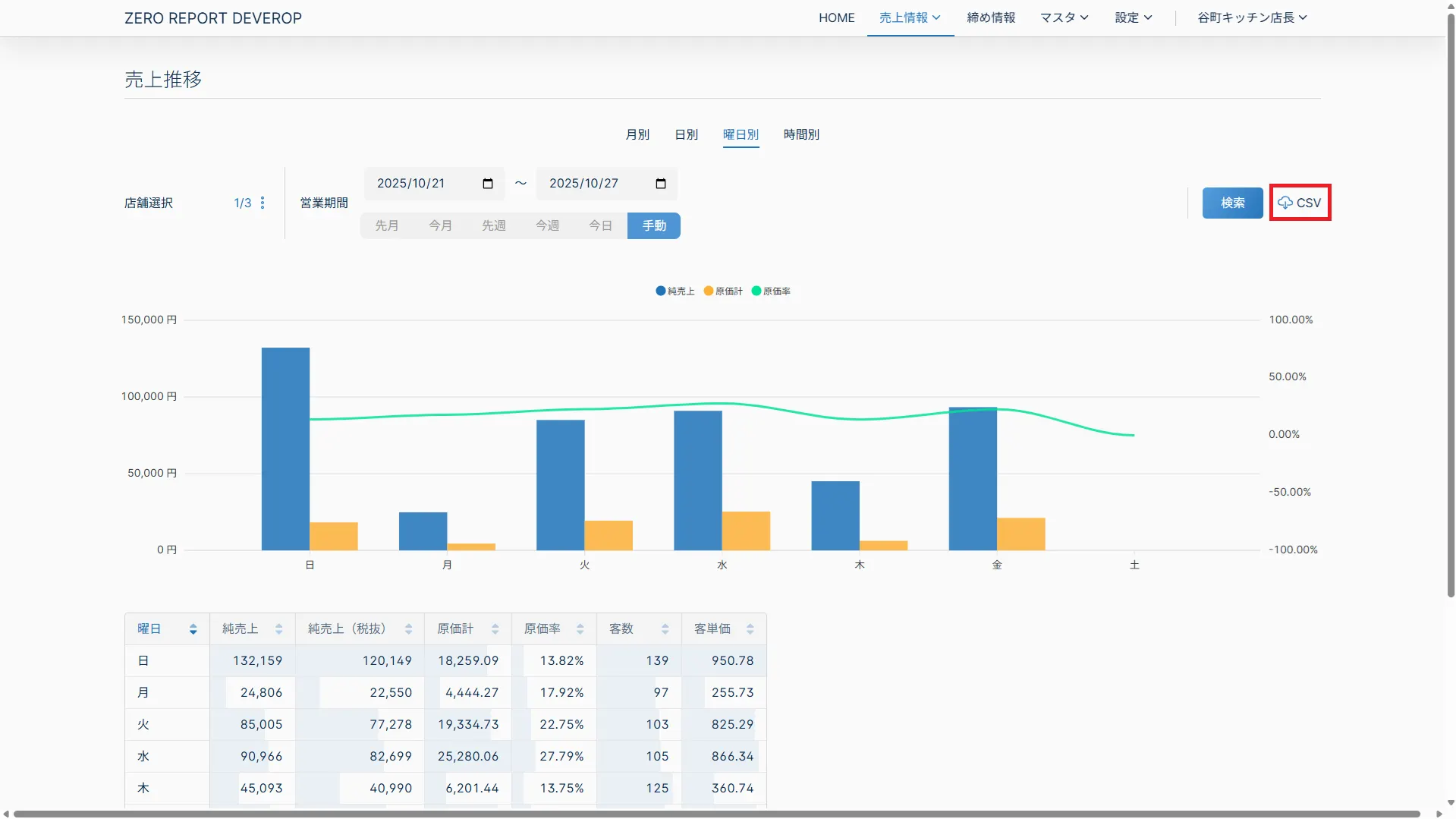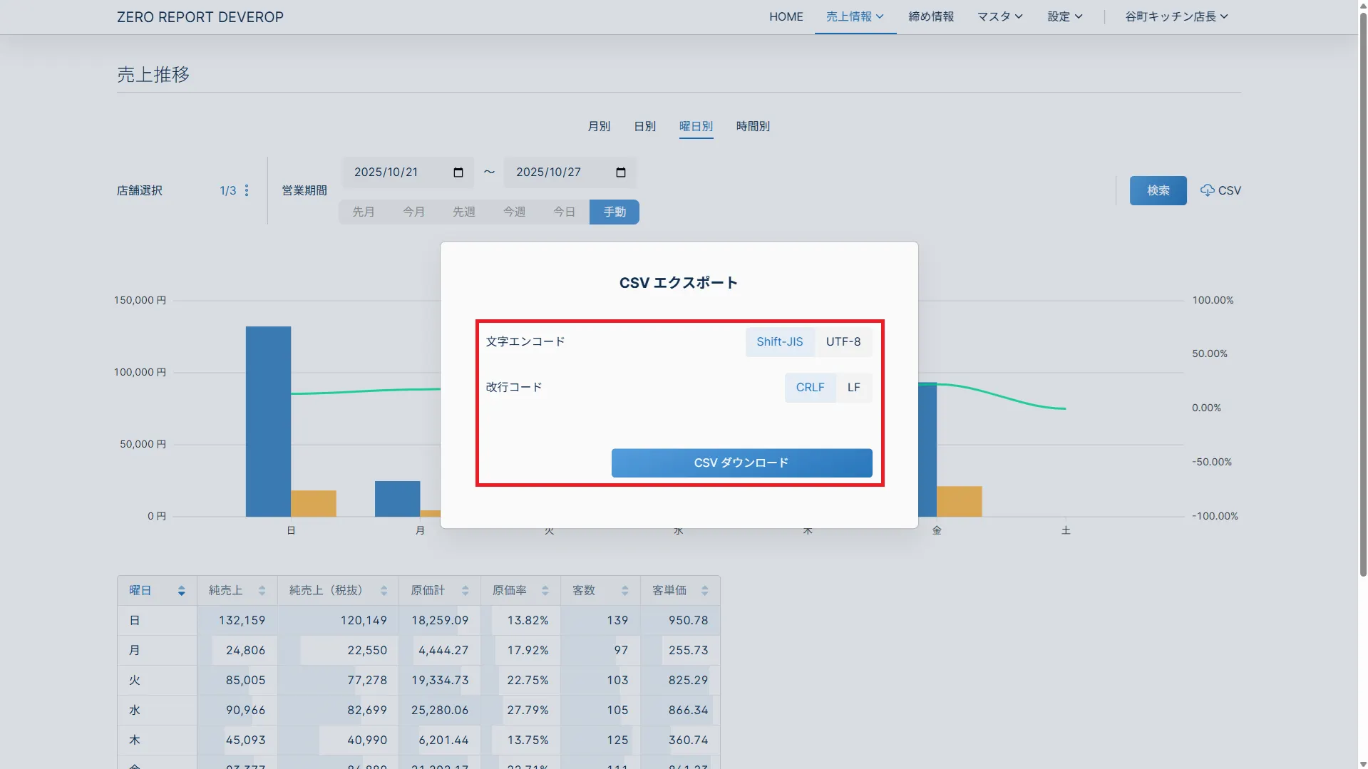 曜日別の売上推移データの表示し、データをCSVエクスポートします。