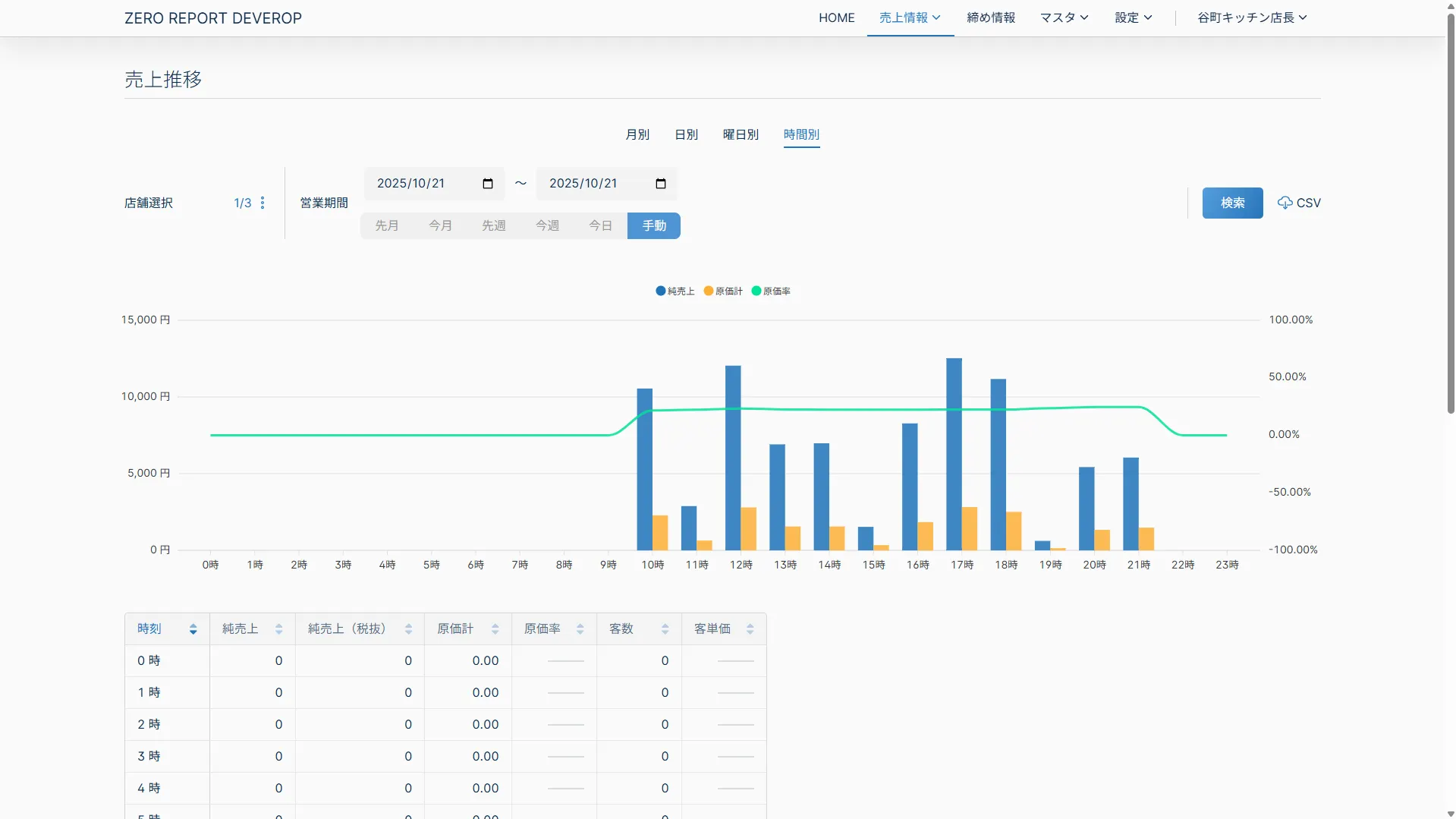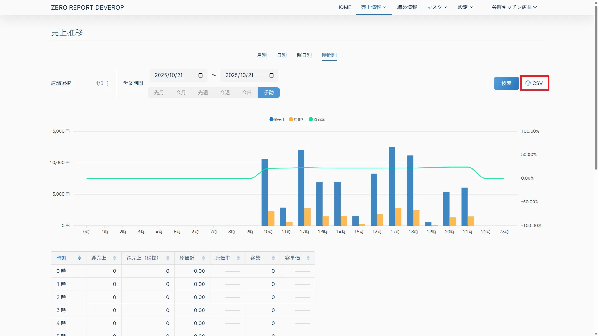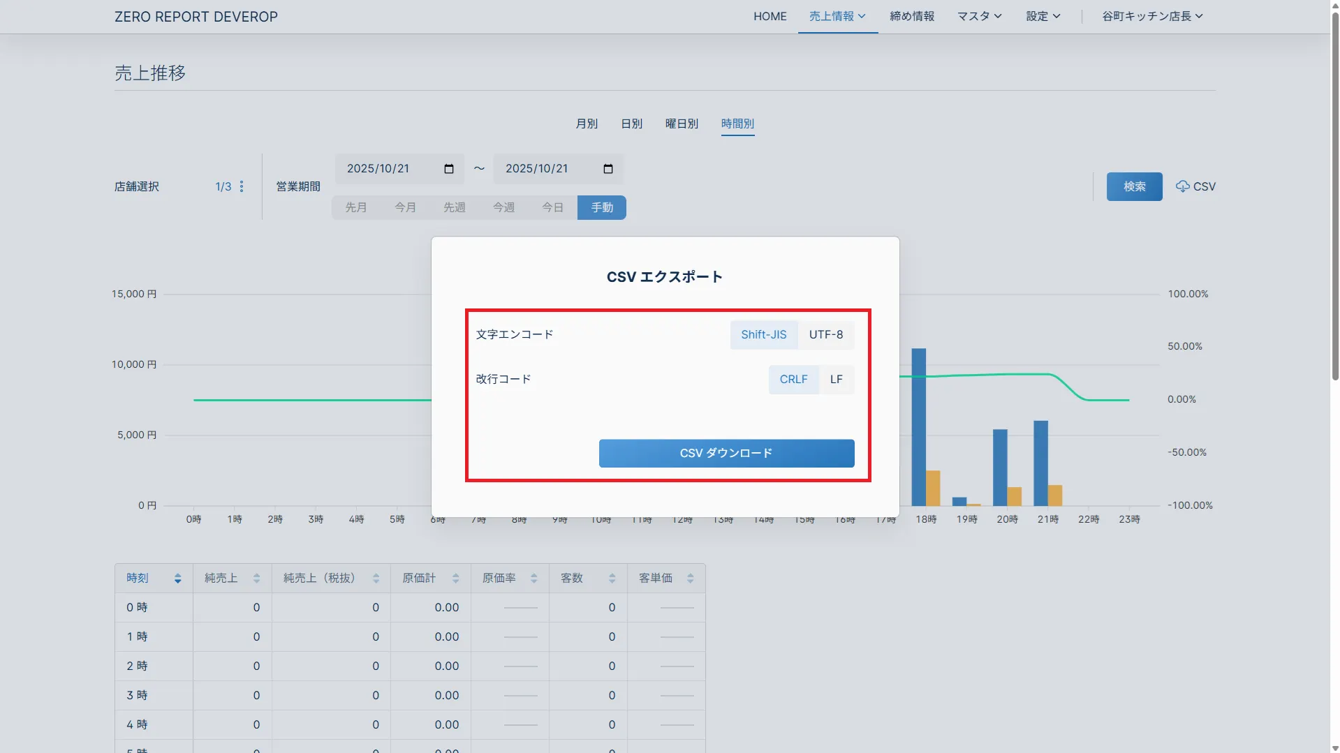 時間別の売上推移データの表示し、データをCSVエクスポートします。