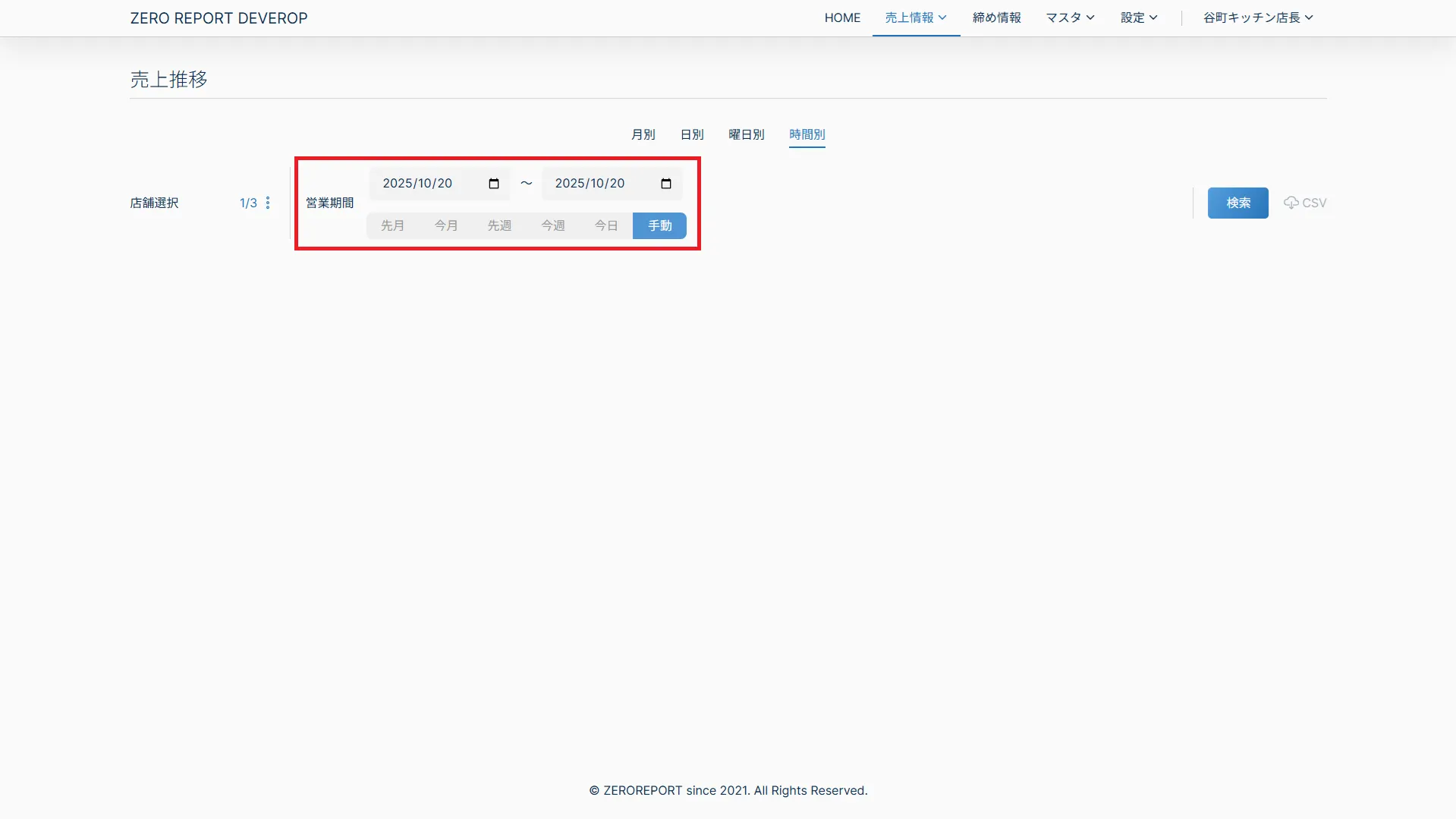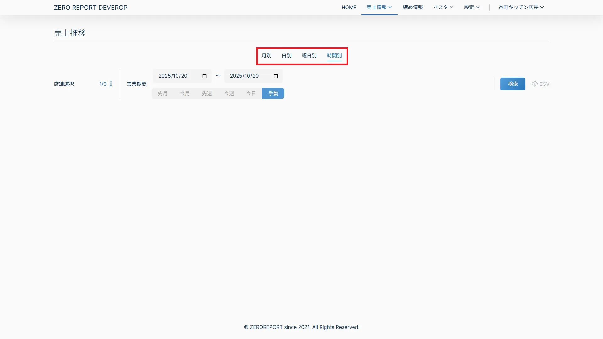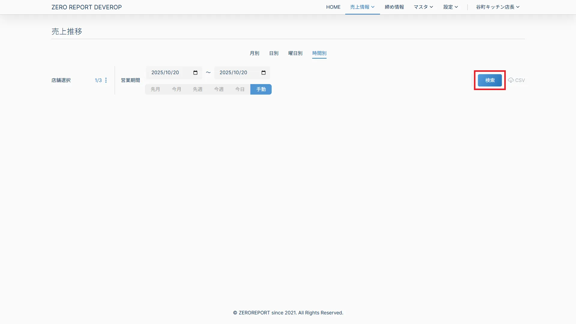 時間別の売上推移データの表示し、データをCSVエクスポートします。